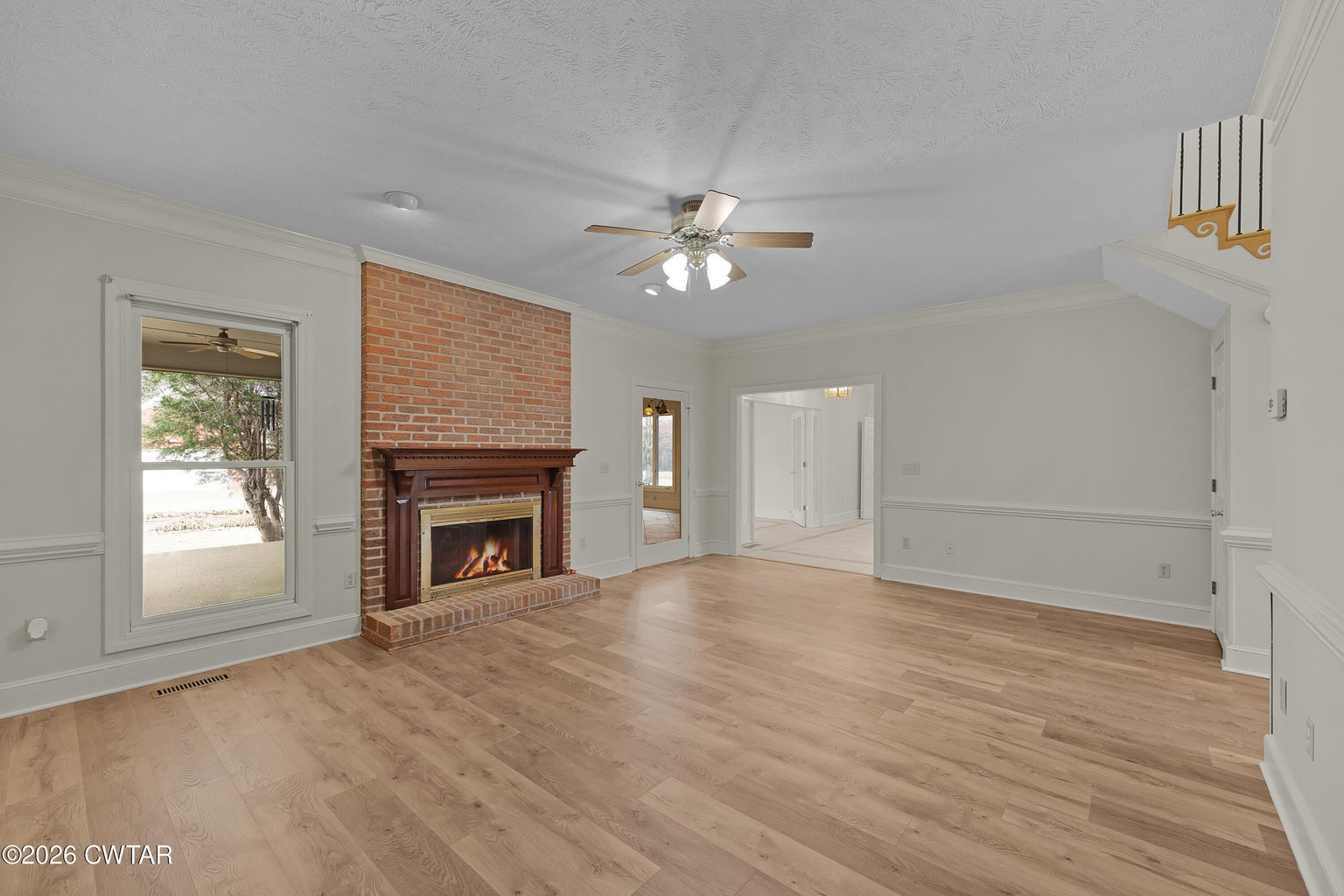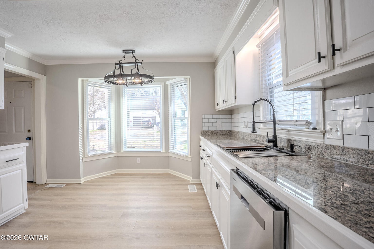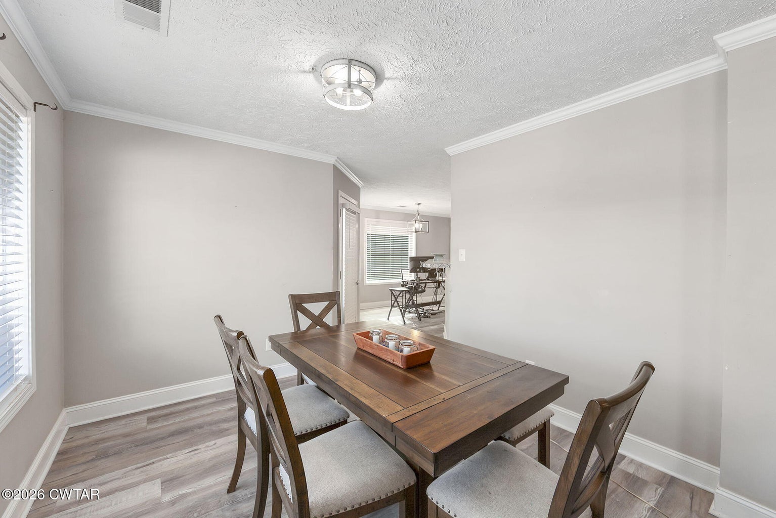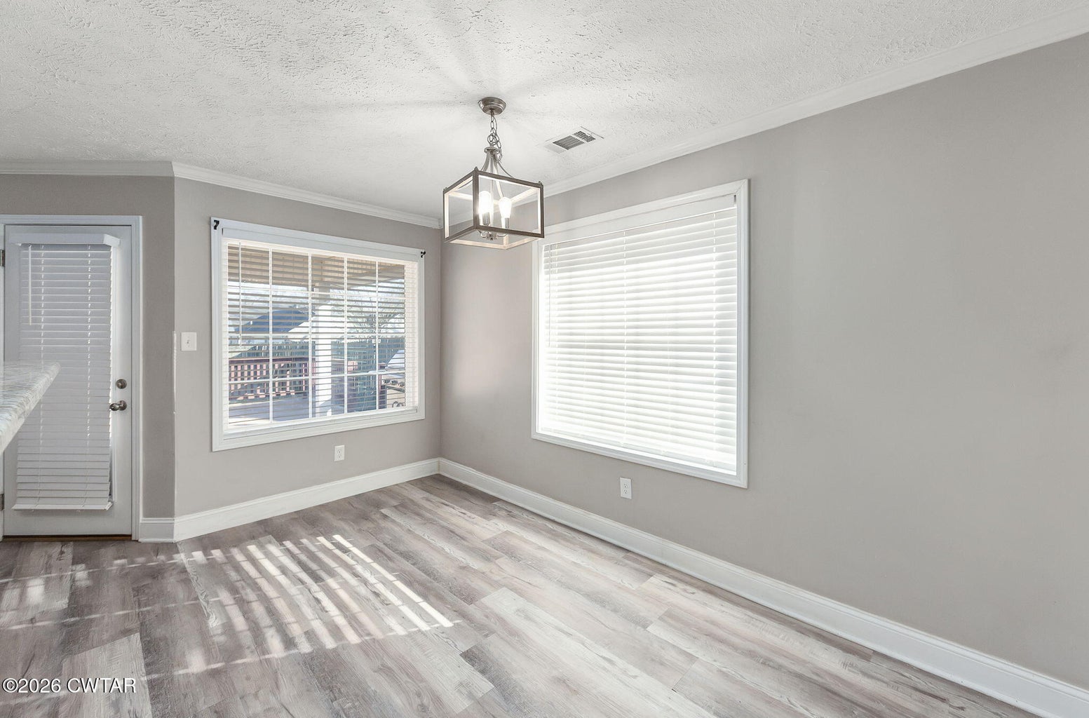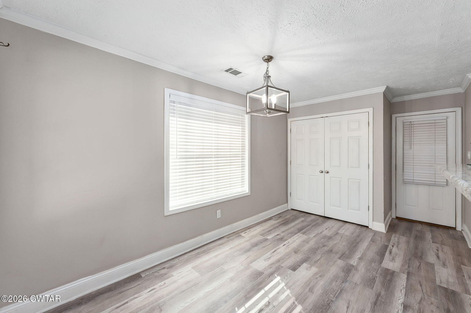 The mature shade trees enhance outdoor enjoyment while helping maintain a cooler, more comfortable setting during hot summer months. A relaxing covered front porch adds classic Southern charm — perfect for morning coffee or unwinding at day's end. Inside, enjoy durable wide-plank LVP flooring throughout — no carpet — paired with decorative crown molding and neutral paint colors.