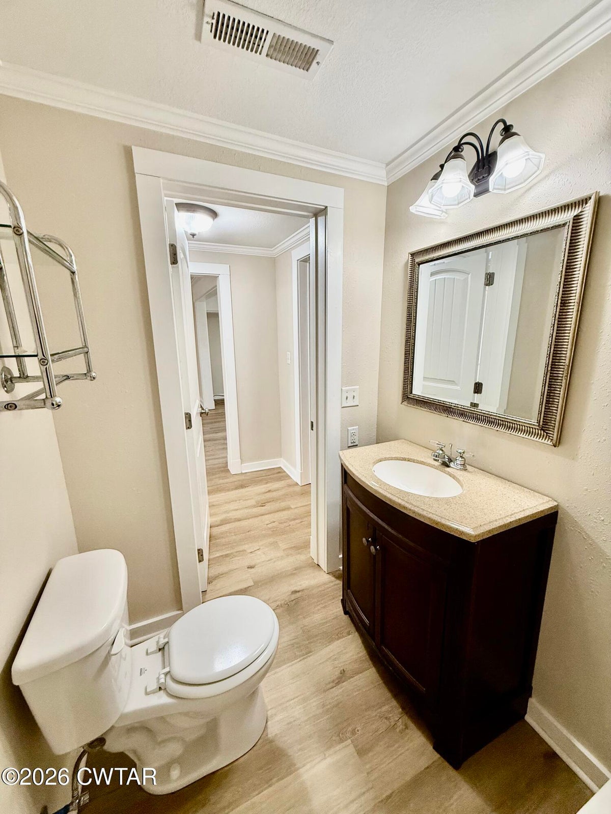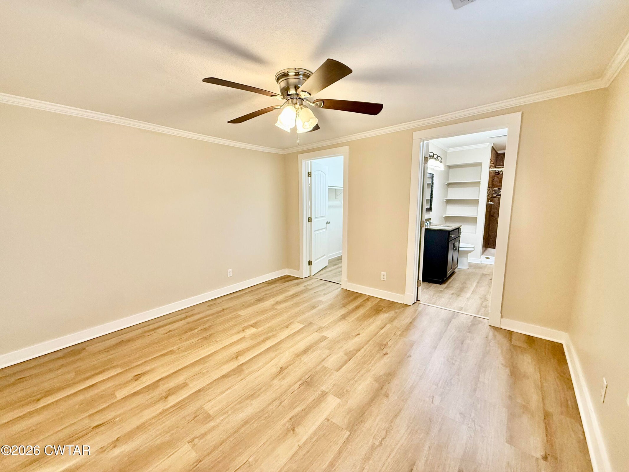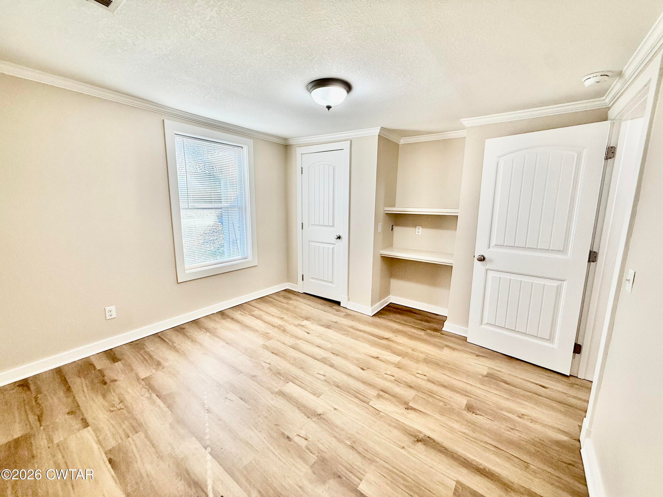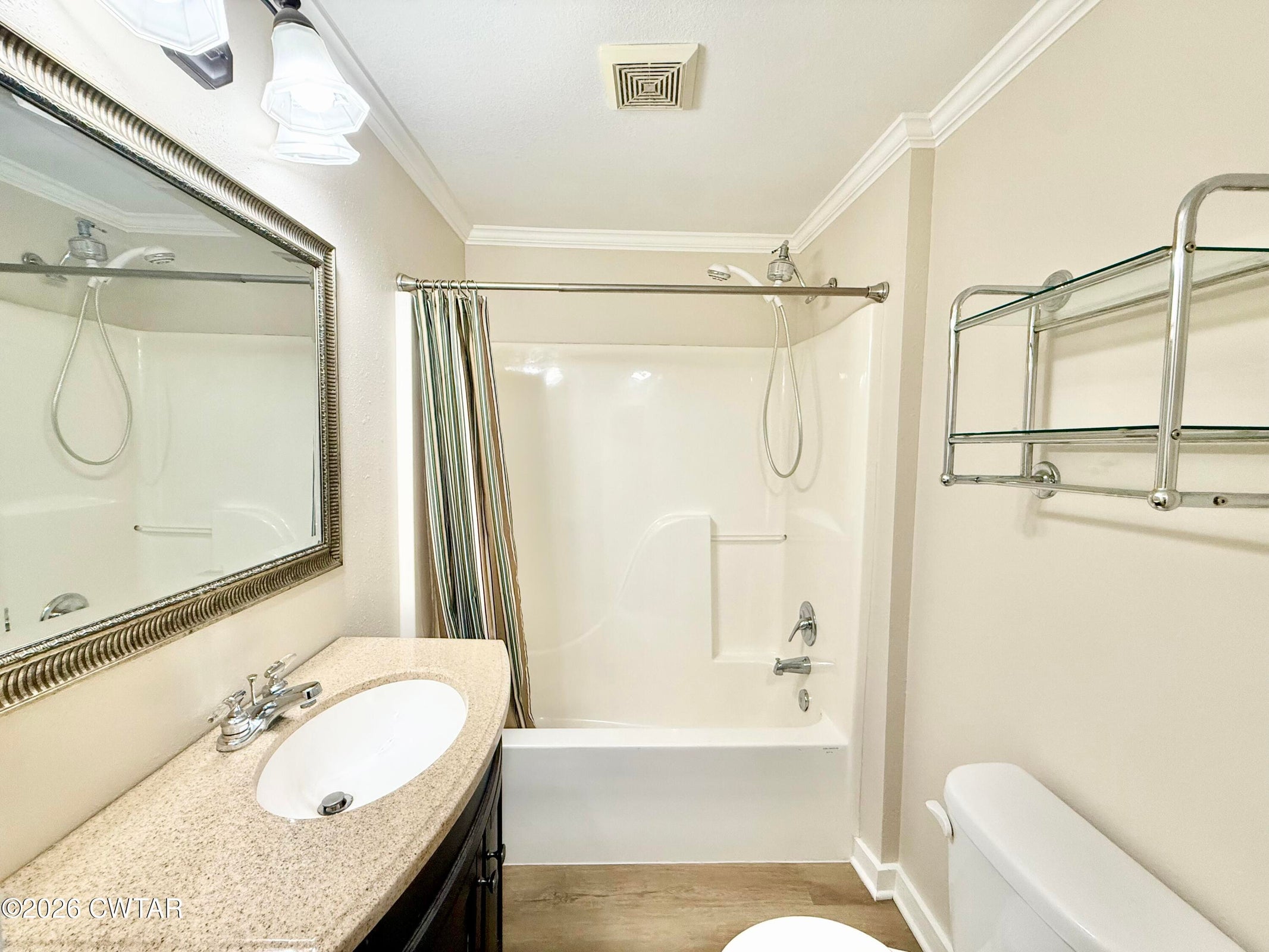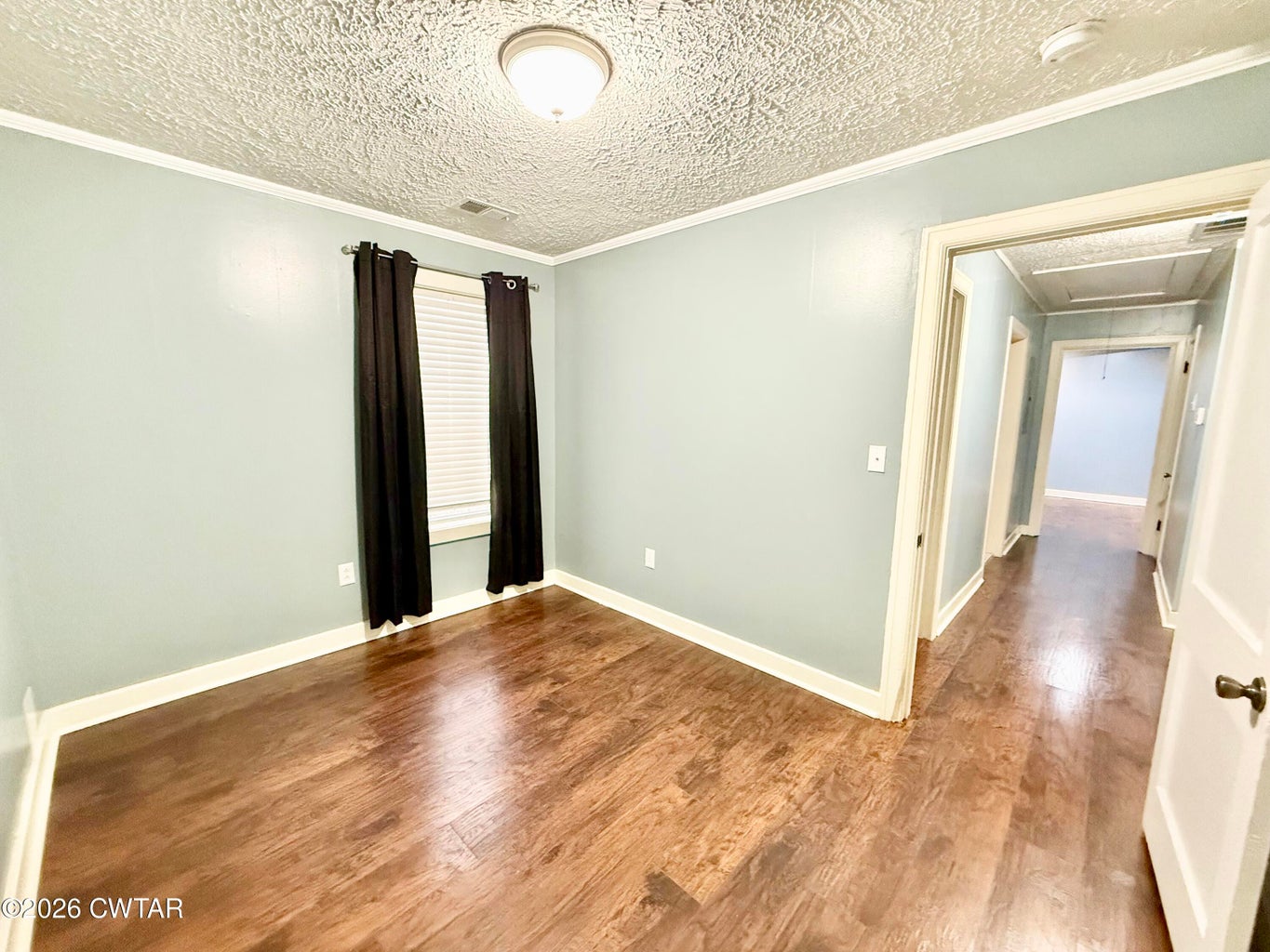 The mature shade trees enhance outdoor enjoyment while helping maintain a cooler, more comfortable setting during hot summer months. A relaxing covered front porch adds classic Southern charm — perfect for morning coffee or unwinding at day's end. Inside, enjoy durable wide-plank LVP flooring throughout — no carpet — paired with decorative crown molding and neutral paint colors.