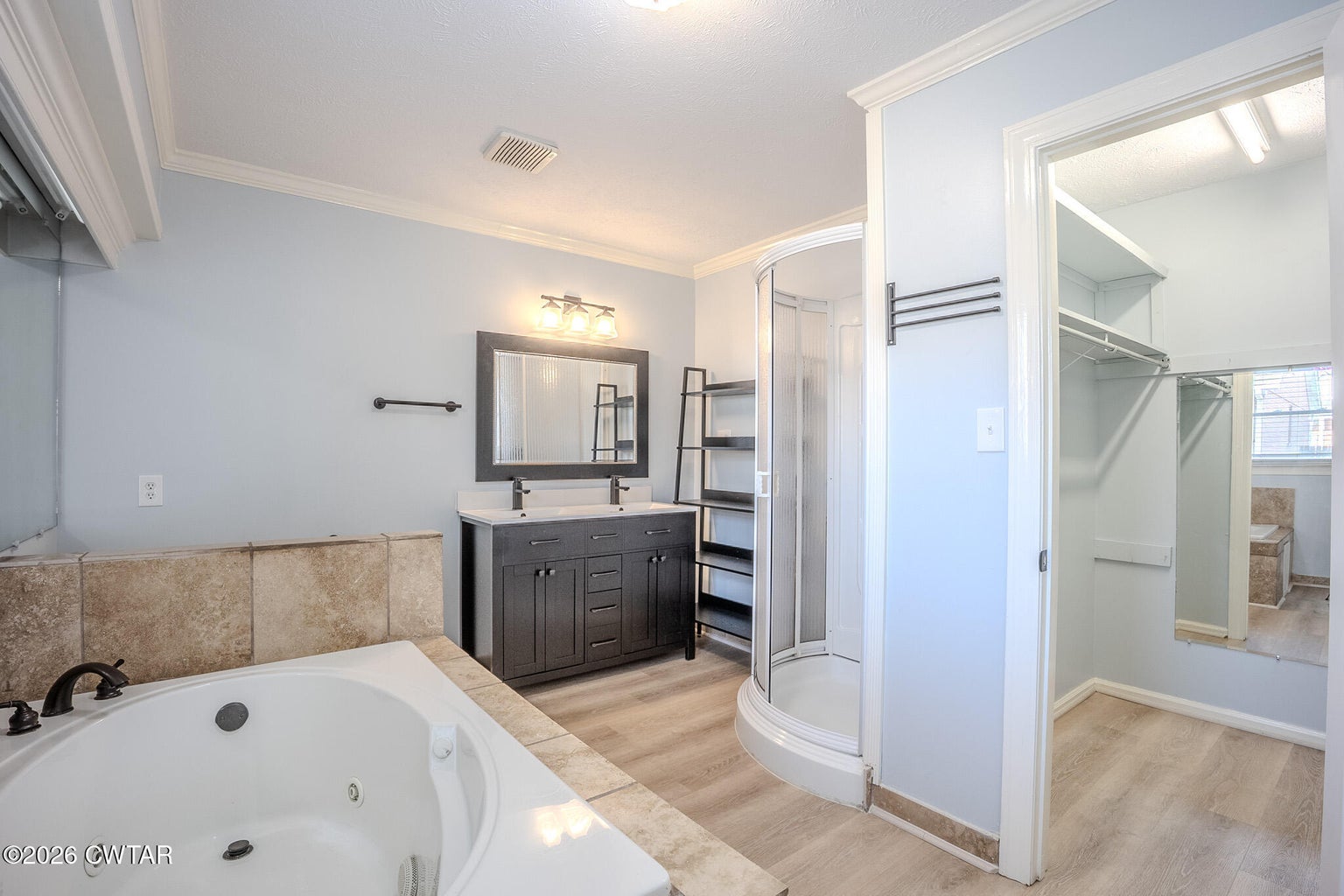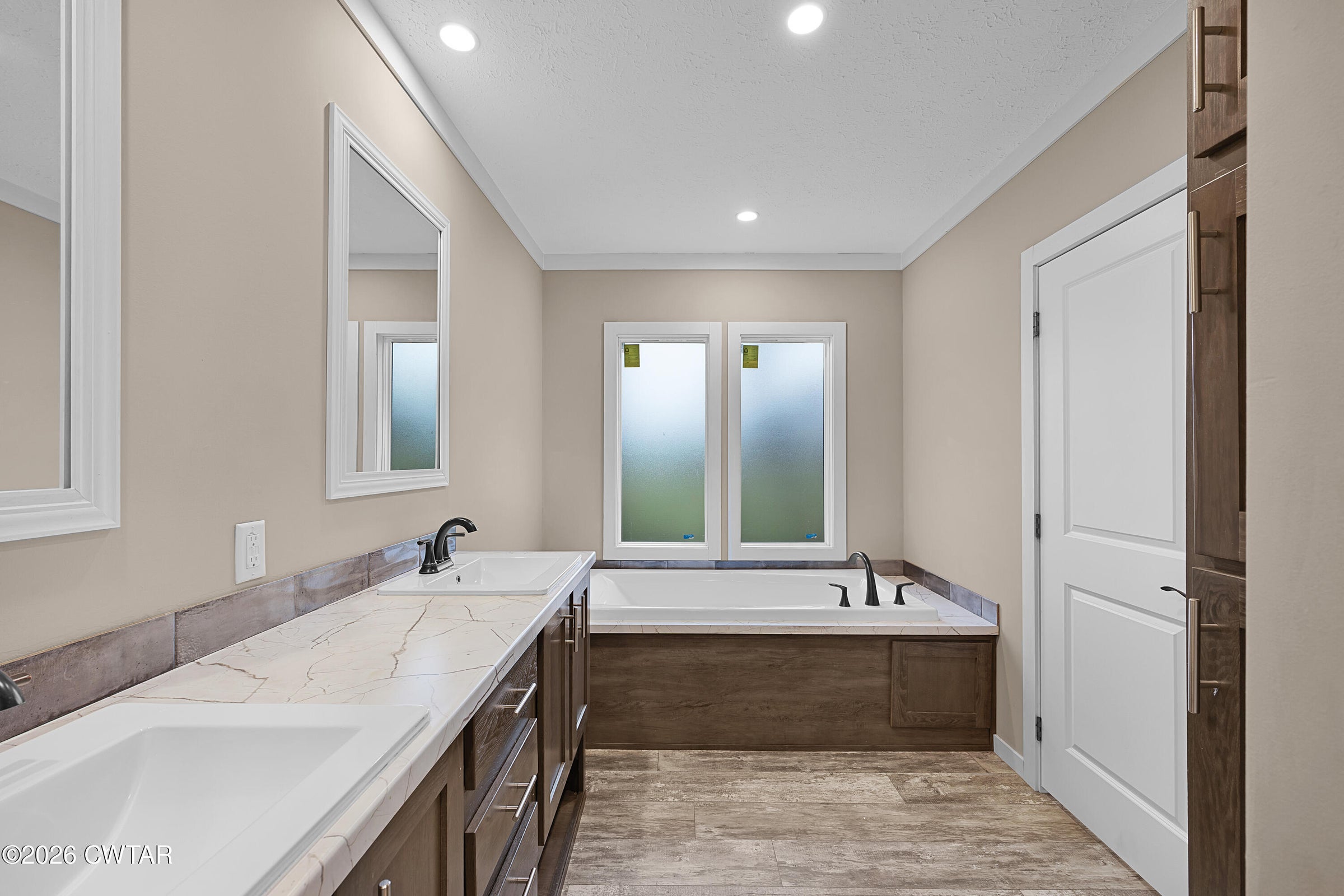 The main level also includes a formal dining room and a flexible office/sunroom, both with LVP flooring. The primary suite is located on the main level and features a tray ceiling and LVP flooring; the en-suite bath includes quartz countertops, a walk-in tile shower, a whirlpool tub with tile surround, tile flooring, and an adjacent 10x6 walk-in closet.