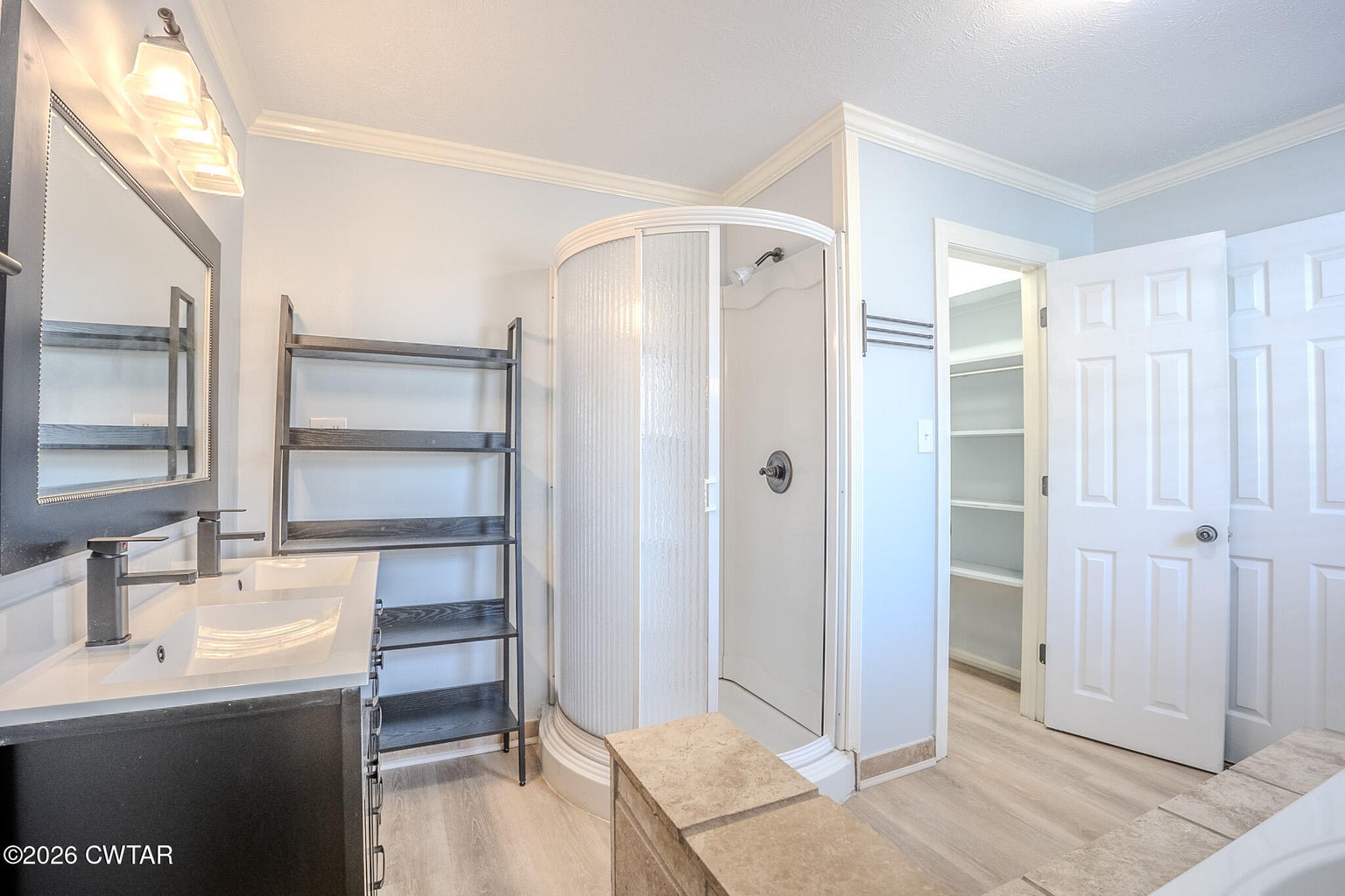 The primary bedroom is located to the left of the living room and offers a generous ensuite bathroom with a separate shower, soaking tub, double vanity, and a large walk in closet. The laundry room includes a washer and dryer, space for a chest or stand up freezer, and an additional door leading to the backyard.