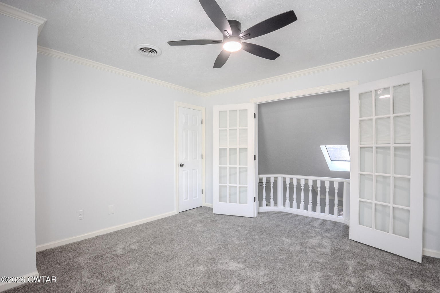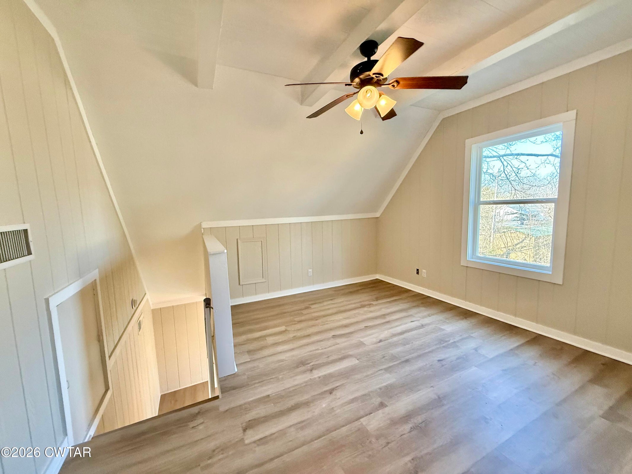 The spacious great room features an open, flowing layout into the kitchen, highlighted by a wide cased opening with decorative header that enhances openness and natural light. Bright, updated kitchen features abundant white shaker-style cabinetry with modern hardware, ample counter space, warm tile backsplash, under-cabinet lighting, stainless steel appliances, picture window providing excellent natural light, built-in open shelving for display and storage, and a generous kitchen footprint offering excellent flexibility for a future working island, furniture pantry, coffee bar, or expanded prep/storage, accented by a decorative chamfered cased opening leading seamlessly into the dining area. The private dining area is positioned just behind the kitchen, offering a peaceful rear-yard view through French-style double glass doors that open directly to the low-maintenance composite deck with wood railing and modern square balusters — perfect for relaxing or entertaining while enjoying the shaded backyard. Bathrooms feature granite countertops, with built-in shelving in the primary bath. Upstairs loft serves as the third bedroom, showcasing vaulted ceiling, decorative beams, and window overlooking the shaded backyard. The primary bedroom closet features custom wood shelving for enhanced organization. With its stylish updates, inviting layout, and exceptional overall care, this home offers the move-in ready condition you've been searching for. Low annual property taxes (currently $655.35).