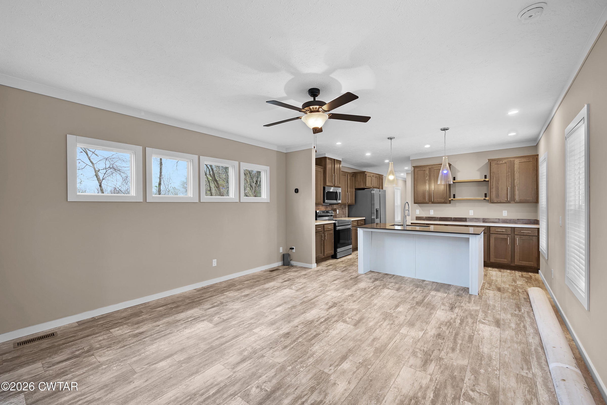 New construction in Milan featuring 3 bedrooms and 2 bathrooms with an open floor plan. The foyer leads into a spacious great room with a dining area to the right.