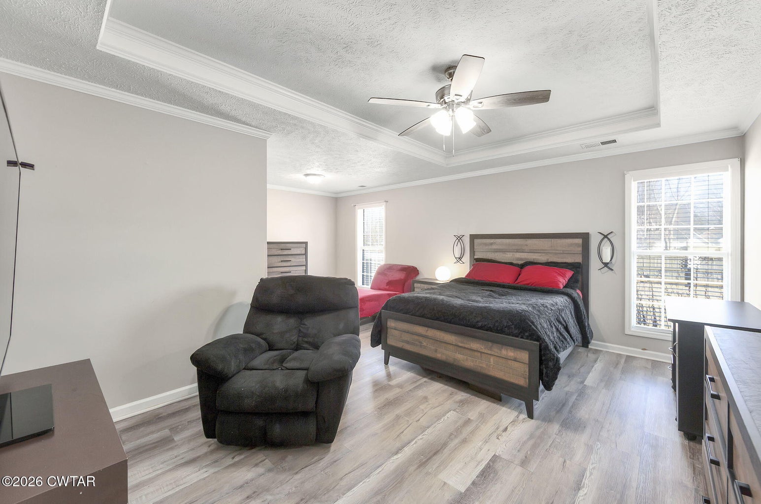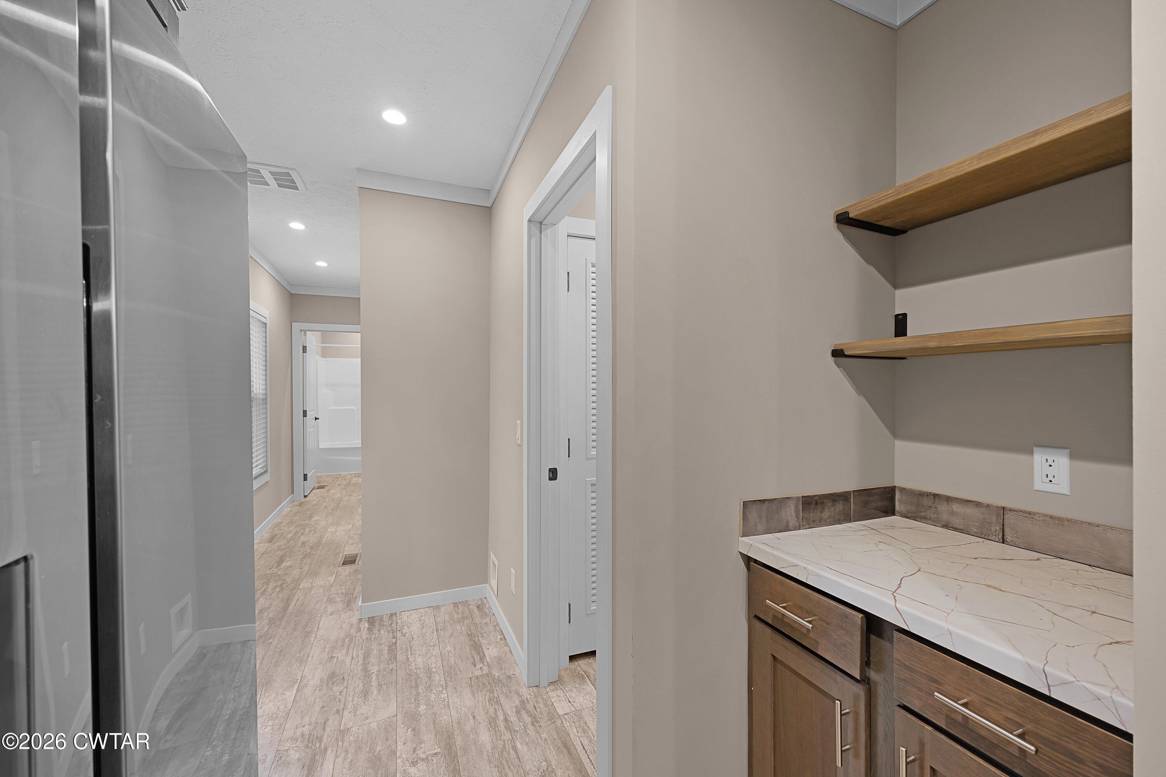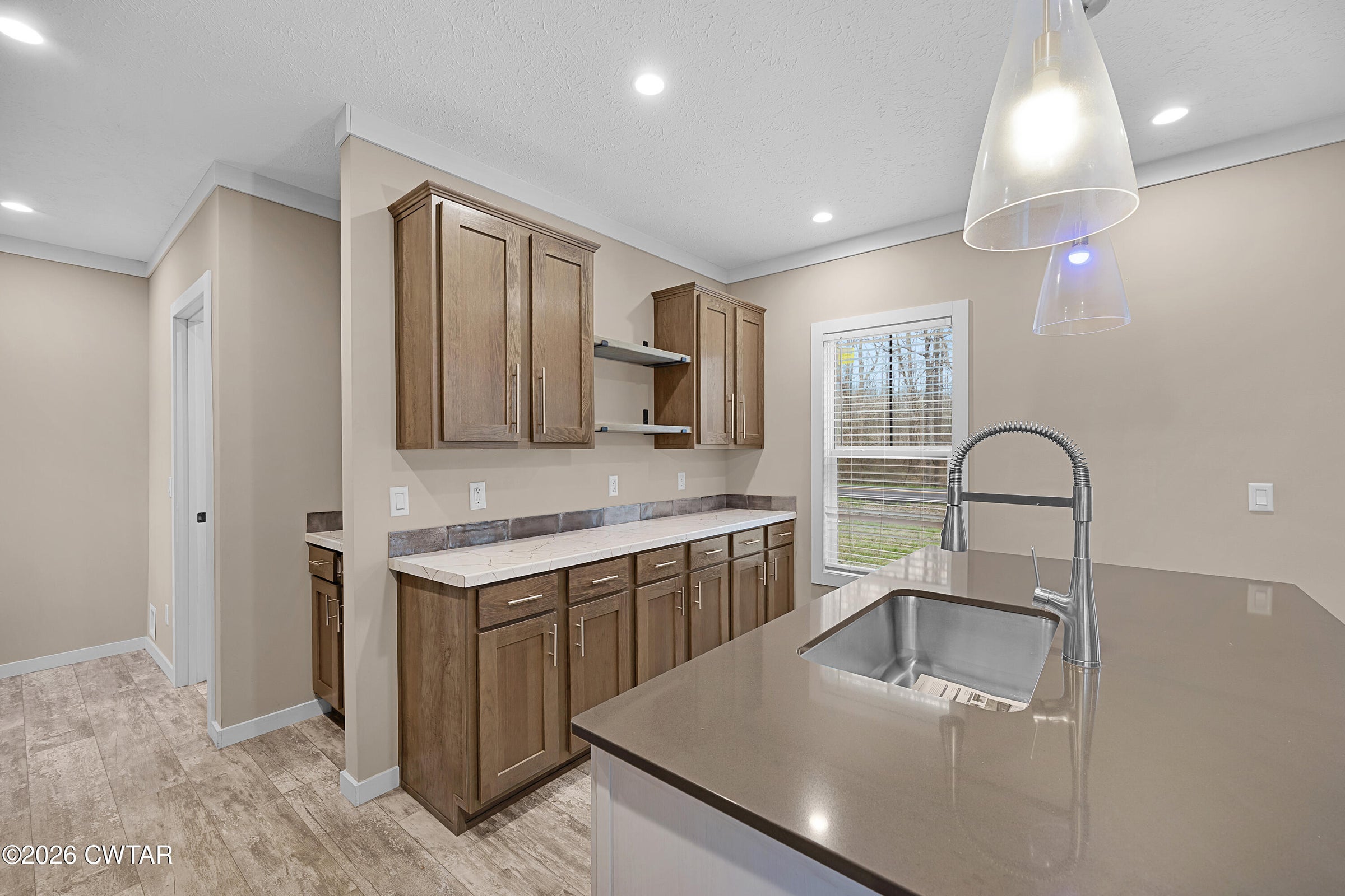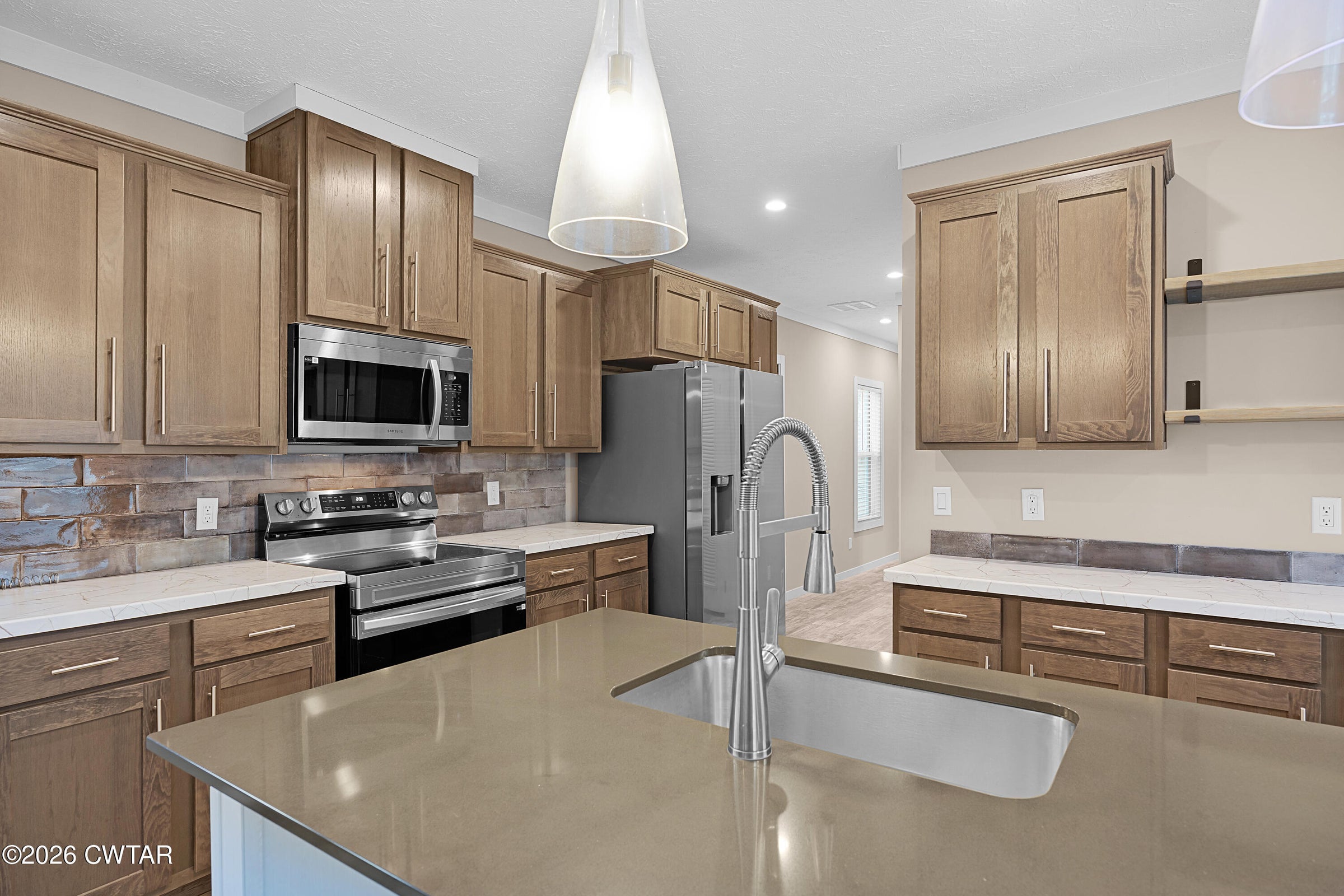 Welcome to 265 Chronicles Drive, a stunning contemporary ranch in the coveted Jabez Estates in Medina, TN. This 1.5-story, 4-bedroom, 2-bath home offers 2,154 heated sq. ft. of modern living space, including an office (which could also be a walk-in pantry) and a versatile 4th bedroom/rec room upstairs. Step inside to a split-bedroom floor plan with luxury vinyl plank and ceramic tile flooring throughout, hardwood stair treads—NO carpet! 9' ceilings downstairs, 2-panel arch top interior doors with bead board detailing, and lots of crown molding! The spacious great room features a gorgeous corner stacked stone gas log fireplace, perfect for cozy nights in.