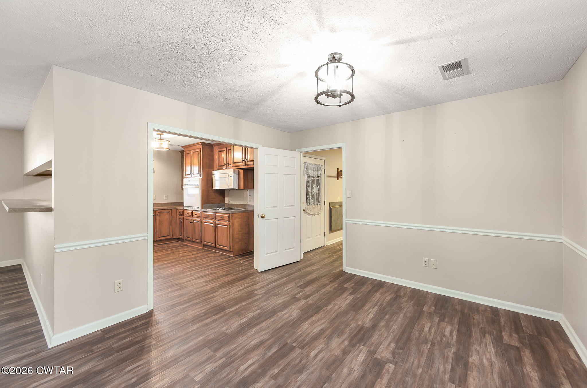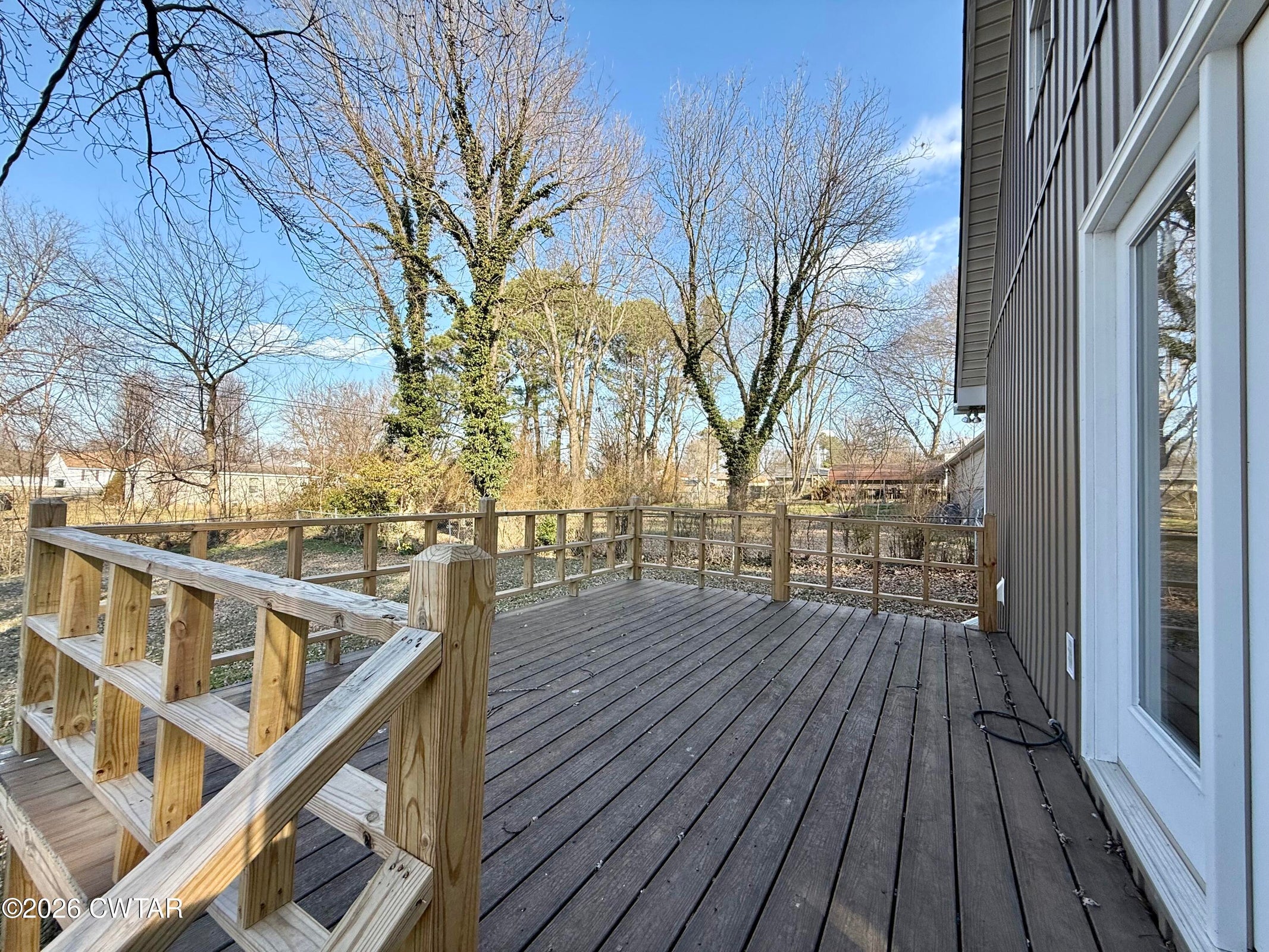 The dining area, located just off the kitchen, includes a sliding glass door that leads to a large deck, perfect for relaxing, entertaining, or grilling with plenty of privacy.