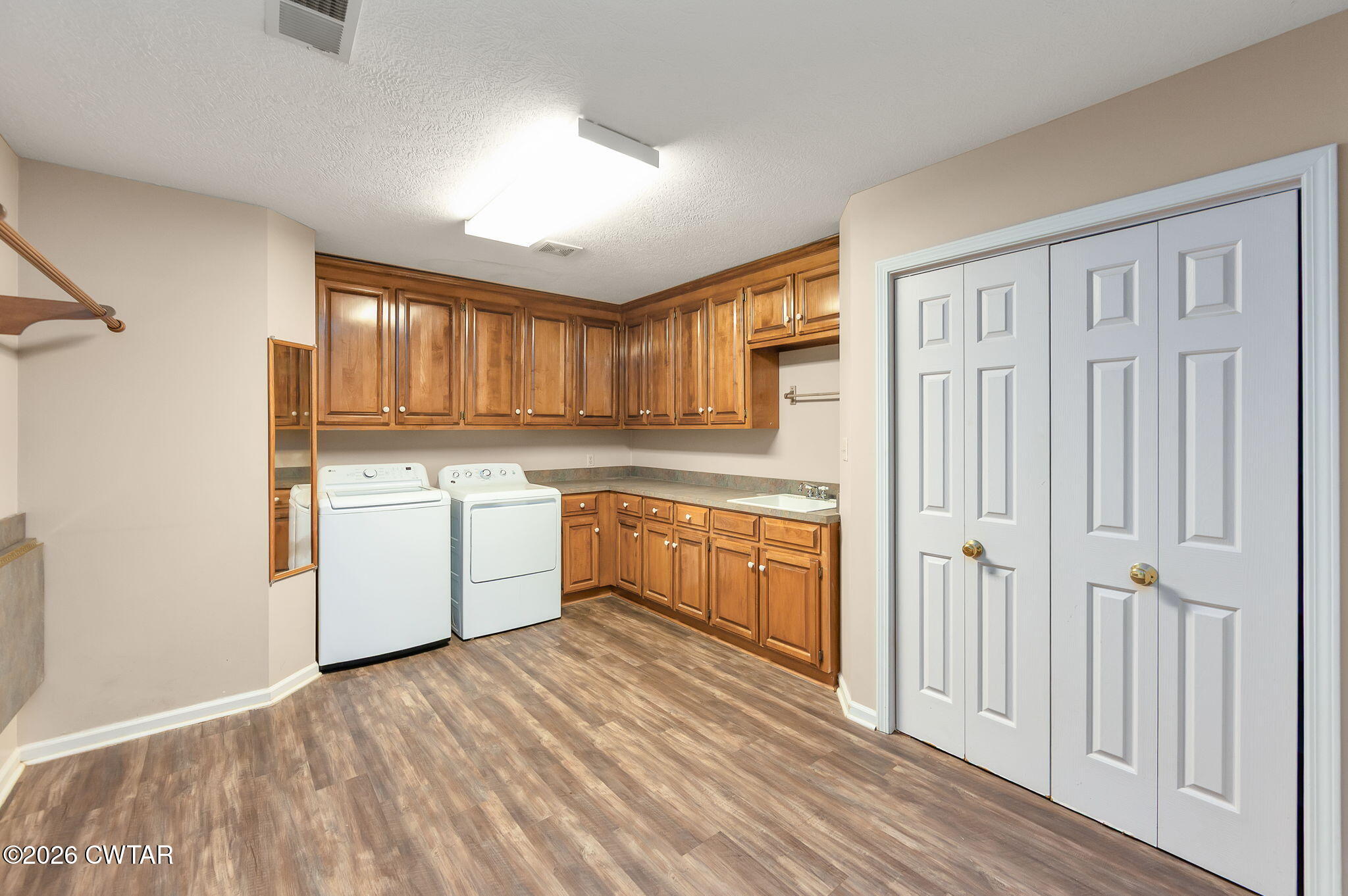 This beautiful home has newly installed Laminate flooring downstairs and new carpet upstairs and has been freshly painted. The kitchen has a Stainless-Steel Jenn Air range and cook top, and a Whirlpool dishwasher. You will enjoy the large walking Pantry just off the Utility Room and Safe room which has an access door to the outside for additional safety.